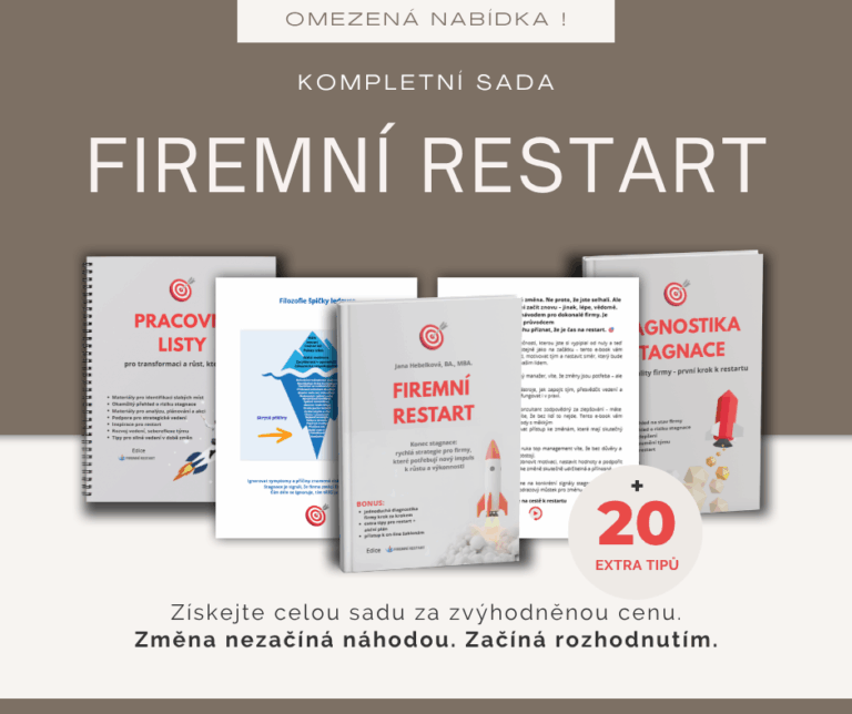 Přečetli jste e-book Firemní restart a rezonují s vámi myšlenky o stagnaci a potřebě změny? Cítíte ten impuls, ale nejste si jisti, jak uchopit první konkrétní kroky? Právě proto jsme pro vás připravili sadu praktických pracovních listů. Jsou mostem, který převádí teorii z e-booku do hmatatelné reality vaší firmy. Zapomeňte na prázdné papíry a nejistotu, kudy začít.